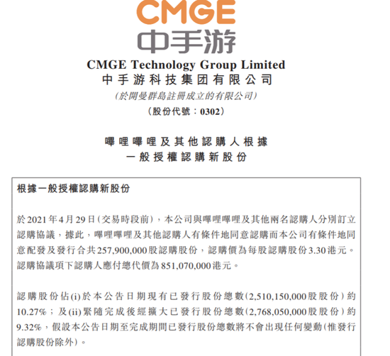 4月29日,哔哩哔哩参与中手游配股。根据公告,中手游拟本次配售2.58亿股,占扩大后股本的9.32%。具体来看,中手游以每股3.3港元(折让9.84%)向哔哩哔哩-SW(09626)、Wide Fortune及CenturyNetwork分别发行1.98亿股、5640万股及350万股。相当于扩大股本7.15%、2.04%及0.13%。所得款项净额8.49亿元。