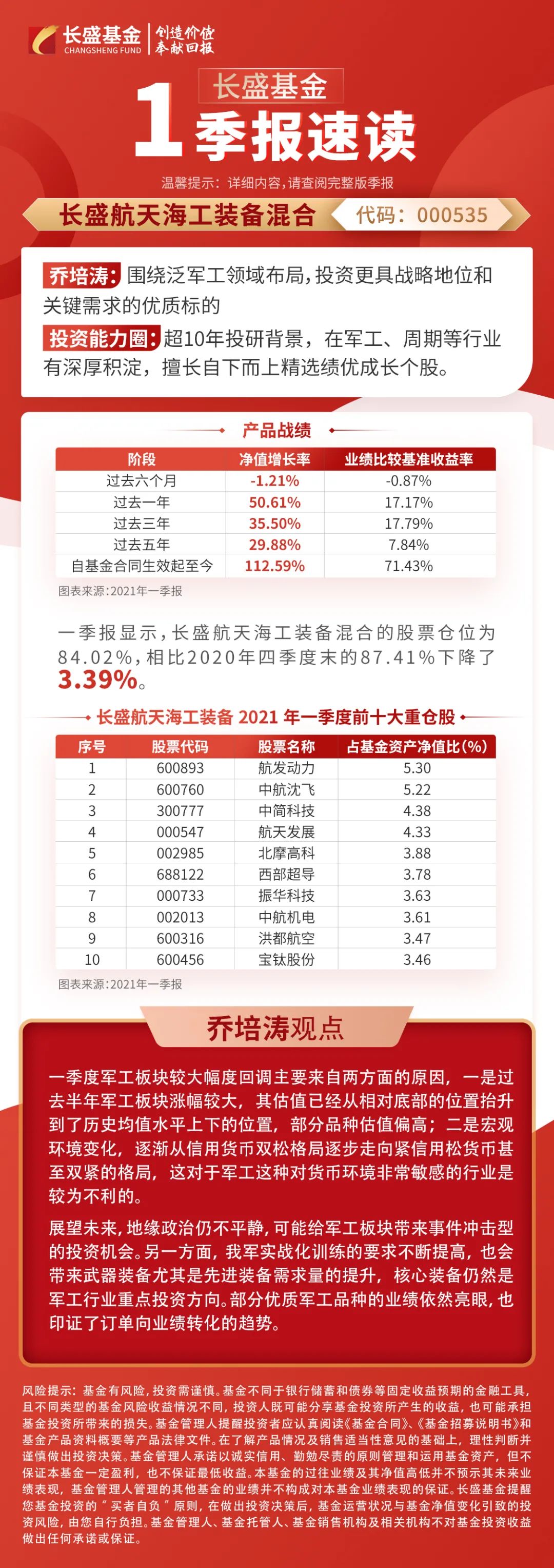 一季报新鲜出炉,近期将不定时随机掉落一季报精华解读,想要迅速掌握一季报重点信息的小伙伴,可千万不要错过哦!干货放送第二弹,今天为大家解读的是乔培涛管理的长盛高端装备(000534)和长盛航天海工(000535),一起来看看吧~