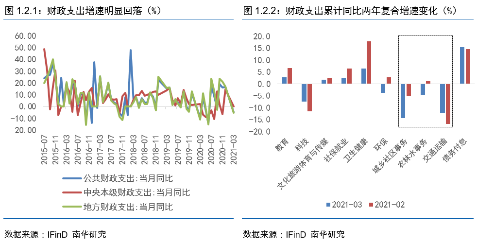 剔除低基数效应后,3月财政支出增速明显回落,体现了一季度财政回归常态的基调。以复合增长率视角看,无论是当月同比还是累计同比,均呈现出公共财政支出增速快速回落的态势,其中中央财政支出较2月小幅回升,地方财政支出则有所回落。