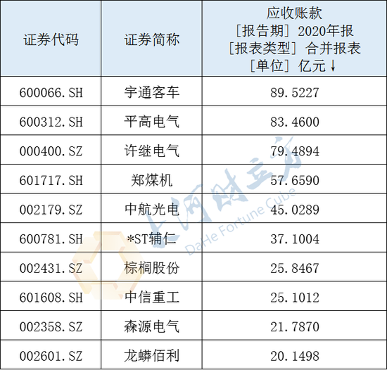 从89家豫股2020年应收账款的情况来看,同往年情况类似,宇通客车、平高电气和许继电气的应收账款位居豫股前列。其中前两家上市公司应收账款超80亿元。