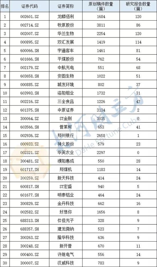 立方舆情通数据显示,在深度研究方面,券商分析师对龙蟒佰利、城发环境、宇通客车等数家上市公司的关注程度较深,撰写深度研究报告数量居前。