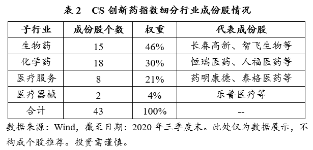 从指数成份来看,生物药、化学药、医疗服务在CS创新药指数中占比较大,所属三个子行业的上市公司权重占比合计超过九成。其中所属生物药的上市公司权重占比合计达到46%,为占比最大的子行业;而所属化学药的上市公司数量共有18只,为成份股个数最多的子行业。从各个子行业的主要成份股代表来看,CS创新药指数基本覆盖了创新药产业链上的龙头企业。