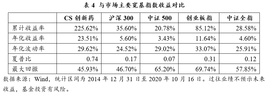 从历史表现来看,从基日(2014年底)至2020年10月16日,CS创新药指数累计收益率为225.62%,年化收益率为23.51%,表现大幅优于同期沪深300指数、创业板指等市场主要宽基指数。同时,该指数历史年化波动率为29.62%,比沪深300指数和中证全指更大,与中证500接近,小于创业板指。综合波动性和收益率,CS创新药指数的历史夏普比为0.74,同样大幅优于市场主要宽基指数,其超越市场的表现十分显著。