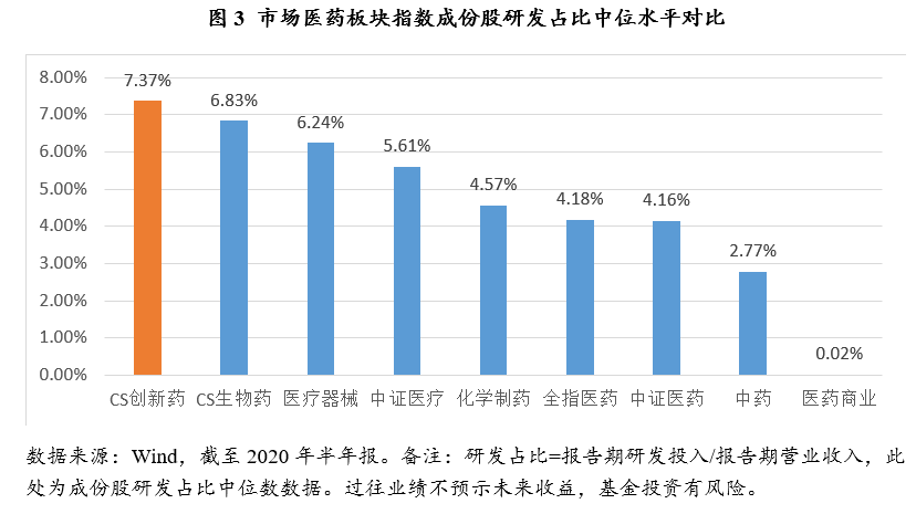 除了历史表现优于绝大多数同类型指数以外,相比其他生物医药类指数,CS创新药在选股层面更加注重个股的研发投入指标。我们统计了2020年半年报中各个医药板块指数成份股的研发投入在营收中的占比,结果显示,CS创新药指数成份股在研发投入上的占比中位水平显著优于大医药板块的其他指数。对于强调研发创新的医药板块来说,研发占比高就意味着未来有更大的可能性获得技术方面的优势,更具竞争力。
