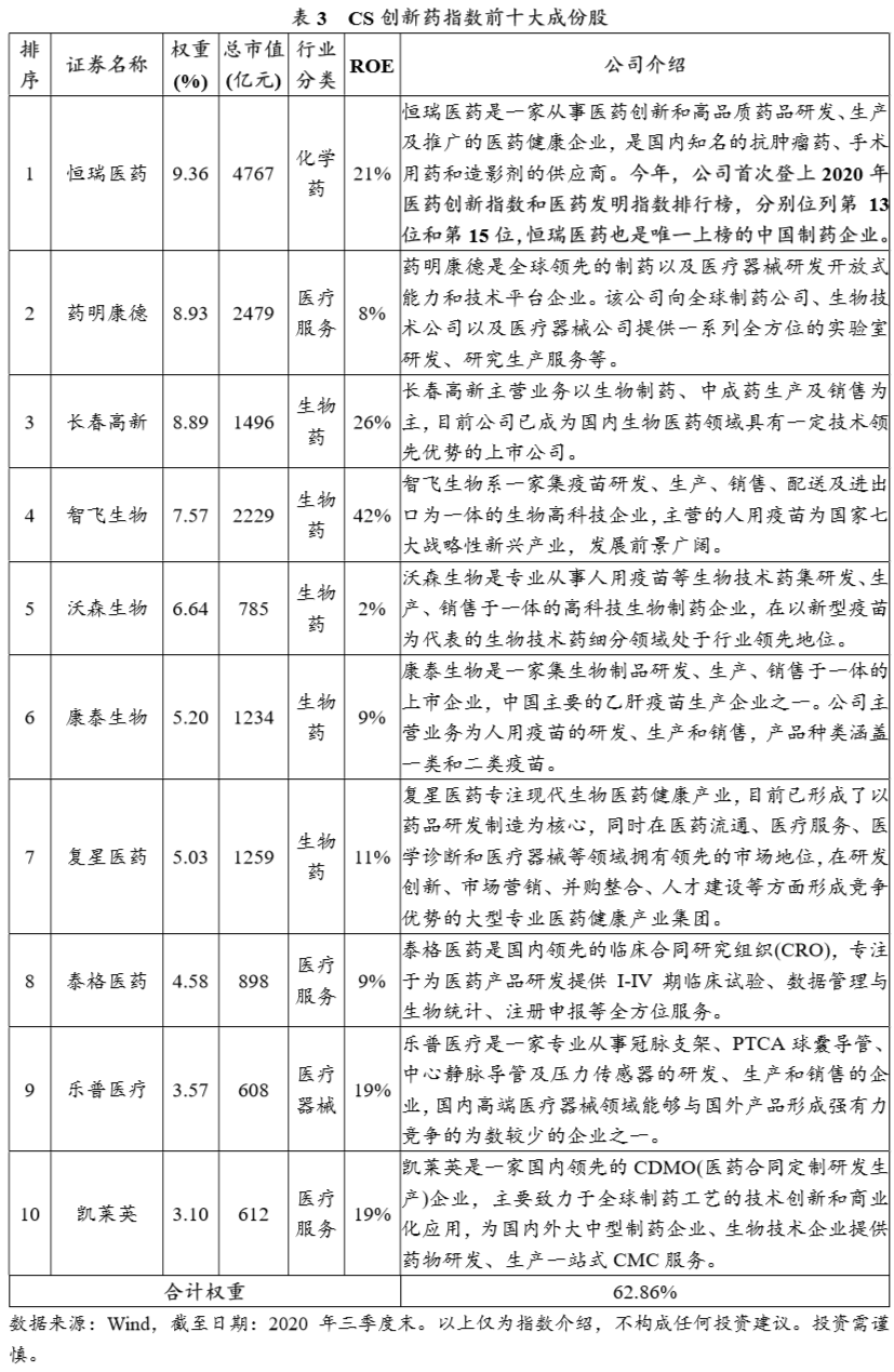 CS创新药指数成份股中包含众多医药行业领先企业,指数前十大成份股权重占比合计达到62.86%,龙头效应显著。其中第一大权重股恒瑞医药(占比9.36%)是一家从事医药创新和高品质药品研发、生产及推广的医药健康企业,是国内知名的抗肿瘤药、手术用药和造影剂的供应商,公司首次登上2020年医药创新指数和医药发明指数排行榜,分别位列第13位和第15位;第二大权重股药明康德(占比8.93%)是全球领先的制药以及医疗器械研发开放式能力和技术平台企业。主要成份股中还包含康泰生物、复星医药等在生物制品研发上具有核心技术和产品的企业,泰格医药等国内领先的CRO龙头公司,以及乐普医疗等专业从事医疗器械研发与生产的领先企业。相关企业的基本面很好,净资产收益率大多长期保持在较高水平,未来成长空间也相对较大。