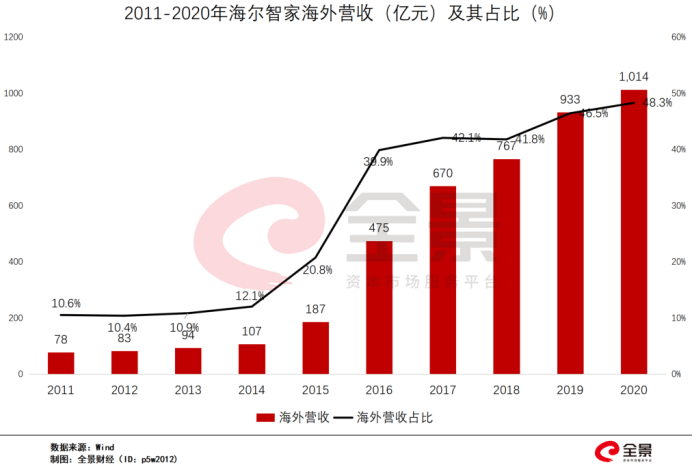 近十年,海尔智家海外营收的总规模以及对营收的贡献度,都不断提高。2020年,海尔智家也实现了全球化战略的又一个里程碑:海外营收首次破千亿,同比增长8.3%。