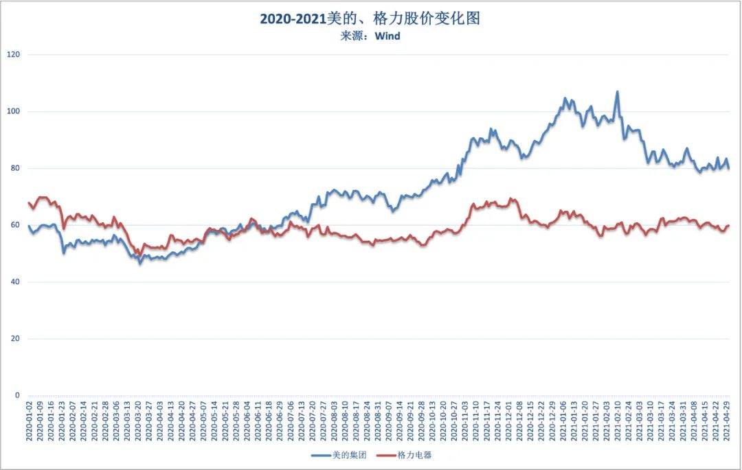 4月30日,两家公司发布财报后的第一个交易日,美的集团股价收于80.17元每股,下跌3.91%;格力电器收于59.91元每股,上涨0.67%。