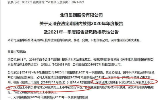 对于年报无法按期发布的原因,*ST北讯表示,公司于2021年4月26日收到中兴华会计师事务所的解除业务约定通知函,2021年2月1日中兴华与公司签订的《2020年度年报审计业务约定书》自公司收到上述通知函之日解除。