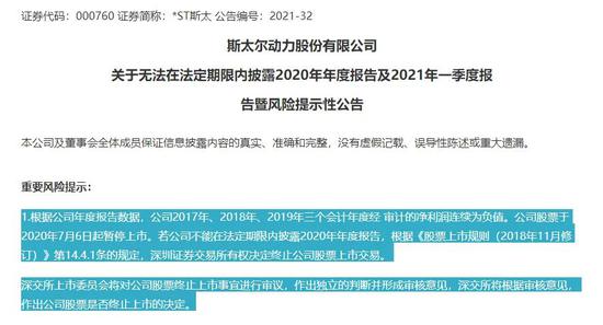 在被告知重大违法强制退市后,*ST斯太又没法按期发布2020年年报和2021年一季报,更是加剧了退市,又多了一重触发退市。