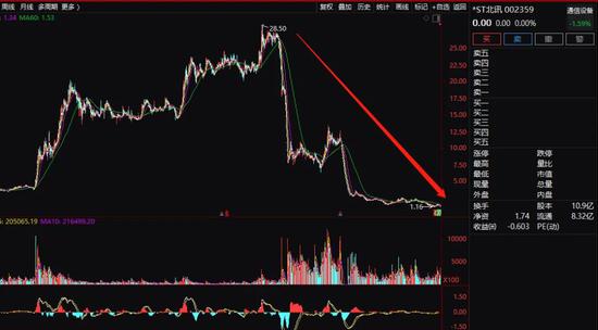 *ST北讯本就是个问题公司,因公司2018年、2019年连续两个会计年度财务会计报告被出具无法表示意见的审计报告,在2020年6月就已经被暂停上市。暂停上市前的收盘价位1.22元,较2018年2月的28.5元高位(前复权)暴跌了95.72%;最新市值只剩13.26亿元。