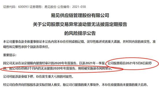 然后到最后一天真的发不出2020年年报和2021年一季报了。然后在5月6日开始停牌。