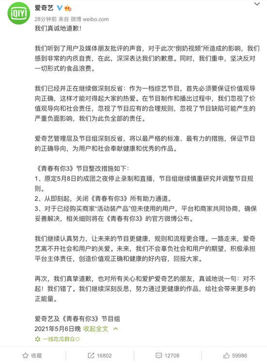 5月6日23点46分,爱奇艺致歉称,对于此次“倒奶视频”所造成的影响,感到非常的内疚自责,在此,深深表达歉意。同时,爱奇艺重申,坚决反对一切形式的食品浪费。