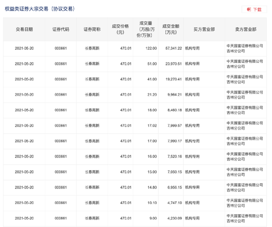 此次长春高新的大宗交易共计分成34笔,其中卖方营业部均为中天国富证券有限公司吉林分公司,而买方中大多数为机构专用。