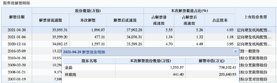 数据显示,2020年12月16日至今,公司总共有三批解禁股,金额接近180亿元。但最值得注意的是,在今年4月20日,长春高新刚刚迎来了一次大规模解禁,解禁数量高达1996.69万股。其中,自然人股东金磊1555.57万股;林殿海441.4万股,两人的解禁市值总额高达94.75亿元。