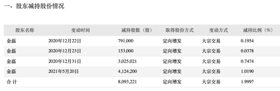 就在一片质疑声中,5月21日,长春高新发布《关于持股5%以上股东减持股份超过1%的公告》,其中显示,金磊于2020年12月22日至2021年5月20日期间以大宗交易方式累计减持公司股份809.32万股,占公司总股本的1.9997%。
