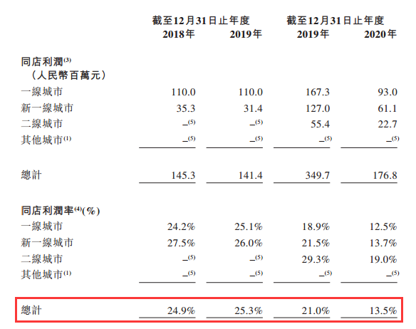 因疫情的影响,就2019年及2020年的相同门店而言,奈雪同店利润率暂时由2019年的21.0%下降至2020年的13.5%。尽管如此,2020年下半年,奈雪同店利润率恢复至17.3%。
