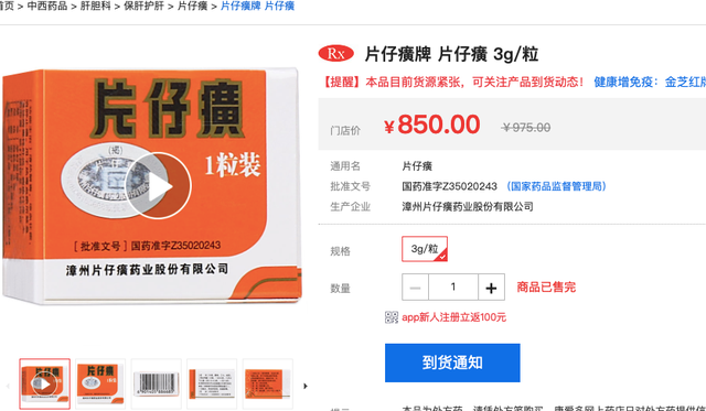 在其他网络售药平台,也有1粒装的片仔癀价格显示为850元,但却提示“产品目前货源紧张”,“货品已售完”。