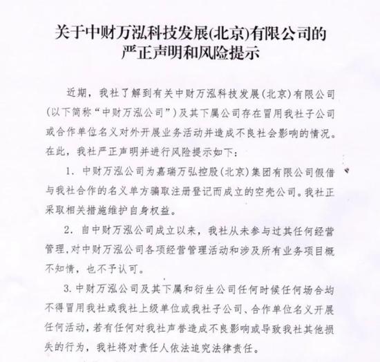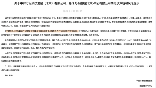 “自中财万泓公司成立以来,我社从未参与过其任何经营管理,对中财万泓公司及其成立后反向变更到其名下的全资子公司嘉瑞万弘公司以及其他子公司各项经营管理活动和涉及所有业务项目概不知情,也不予认可。”声明还表示,由于嘉瑞万弘拒不办理中财万泓公司的注销登记手续,中国财政经济出版社已于2020年7月向北京仲裁委员会申请仲裁。