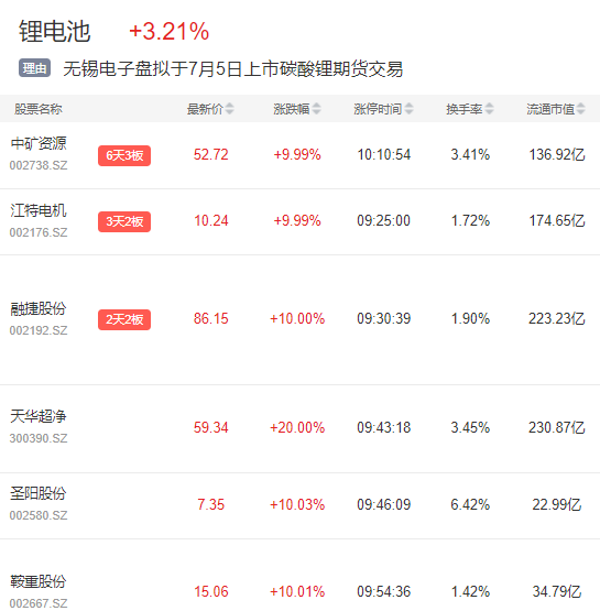 7月5日,锂电池再度掀起涨停潮,江特电机强势三连板,融捷股份、中矿资源二连板,另有天华超净、圣阳股份、久吾高科、成飞集成等多股涨停。