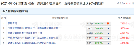据龙虎榜显示,这一轮锂电池龙头江特电机最大买手之一当属机构,根据7月2日披露的三日榜,一机构累计净买入7835万,排名买方第一。