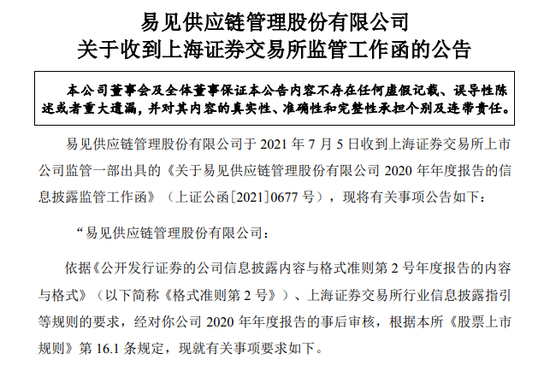 而在7月5日晚间,针对巨额损失追偿、大额减值、资金占用、内控重大缺陷等问题,上交所对易见股份火速下发监管函,要求公司及时整改。