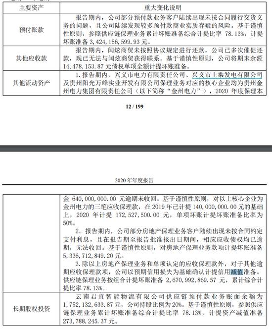 2020年,易见股份计提各项信用减值准备合计116.25亿元,计提资产减值准备合计2.73亿元,两项共计118.99亿元。根据易见股份年报,公司的减值计提涉及多个会计科目,包括预付款项、长期股权投资、应收保理款,多项业务多个客户牵扯其中,其中金额最大的是逾期的房地产保理业务,计提金额达53.36亿元。