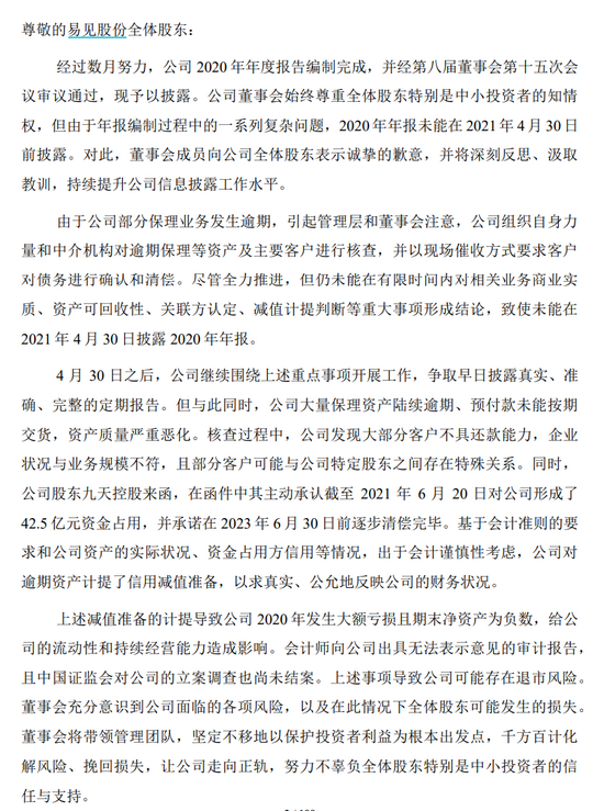 2021年4月30日,易见股份披露公告称,因业务形成的资产、负债及权利义务等需进一步梳理清查,部分重大事项有待进一步落实,无法在法定期限内披露2020年年度报告和2021年第一季度报告。