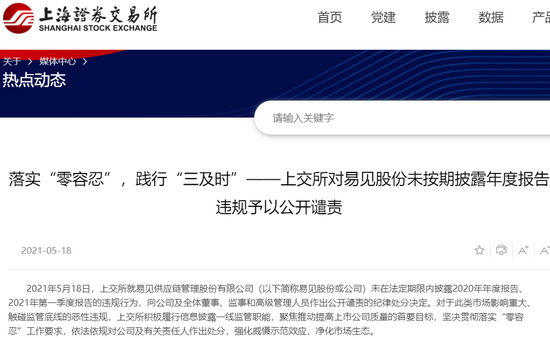 上交所称,易见股份已经停牌,若其在一定期间内仍无法披露2020年年度报告,上交所将依规对其实施退市等相关处理。