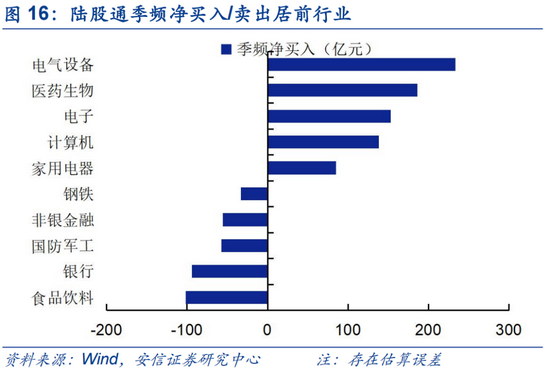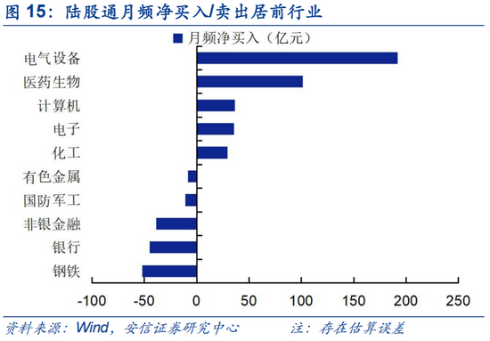 陆股通连续五周增配电气设备居前,电气设备成为陆股通今年以来净流入第一大行业。上周陆股通集中增配食品饮料、电气设备和公共事业行业;银行、非银、医药、有色遭净卖出较多。以周频看,食品饮料(约33亿,两类资金并重)、电气设备(约27亿,配置型资金为主)、公共事业(约9亿,两类资金并重))获北向资金净增持居前;银行(约-39亿,两类资金并重)、非银(约-28亿,交易型资金为主)、医药(约-13亿,交易型资金为主)遭净卖出较多。