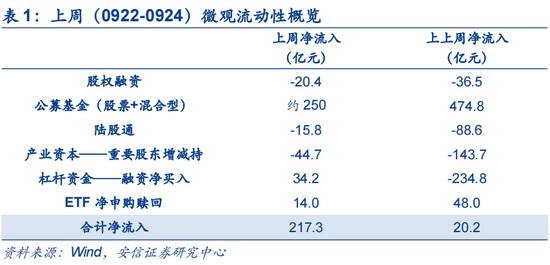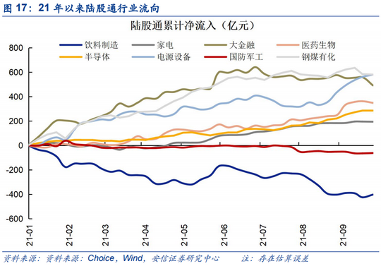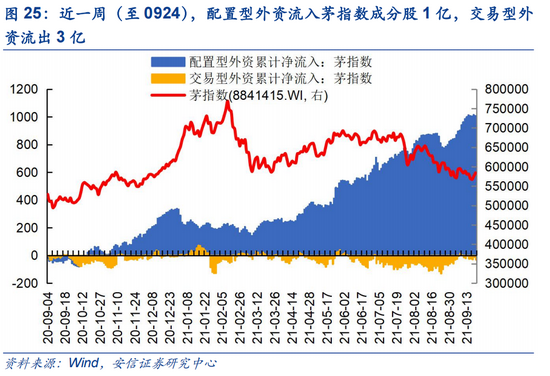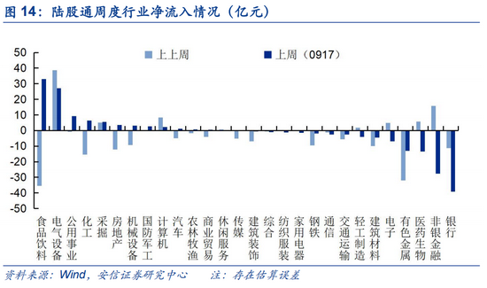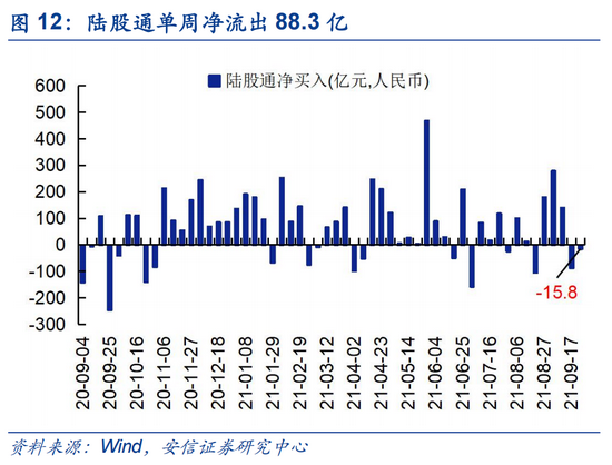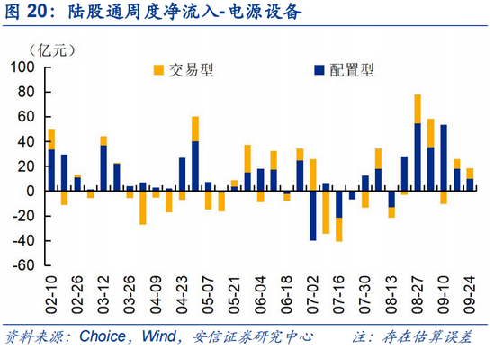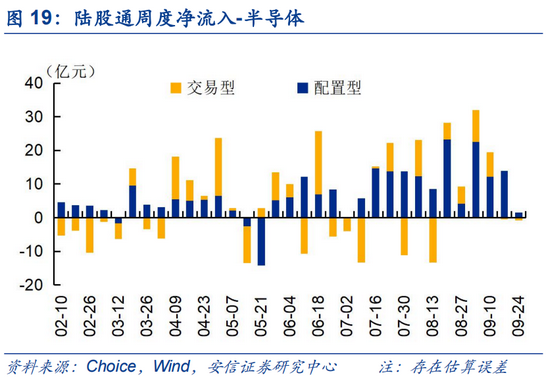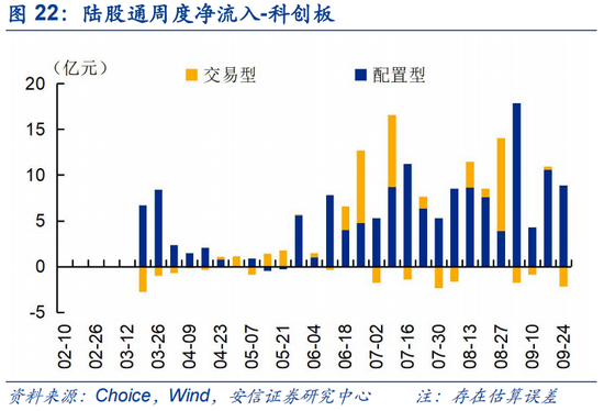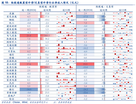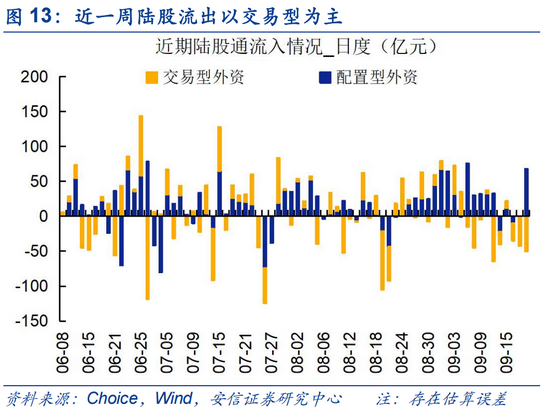 上周(0924)陆股通资金净流入15.8亿,近两周(6个交易日)流出104.0亿。陆股通上周开放两个交易日;近两周来看,陆股通流出资金以交易型为主,交易型、配置型分别净流入约-191亿、80亿。
