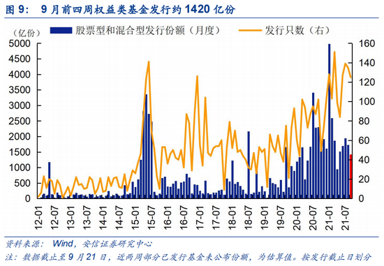 9月前四周权益类基金发行约1420亿,预计全月1600亿,延续环比放缓。9月共有125只基金完成发行,合计募集约1420亿份,持有期一年以上占比约35%。近期公募基金发行速度稳定在400亿/周左右,赎旧买新现象仍存,通过公募基金为市场带来的增量资金实际有限。