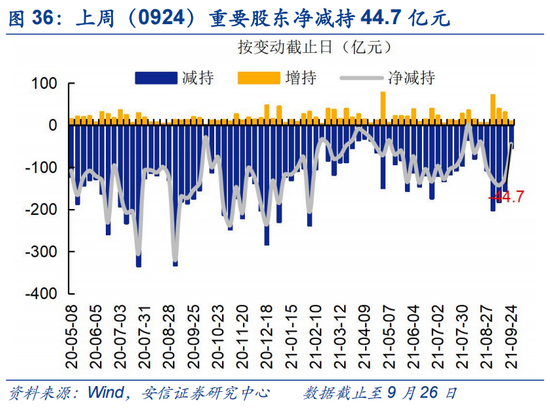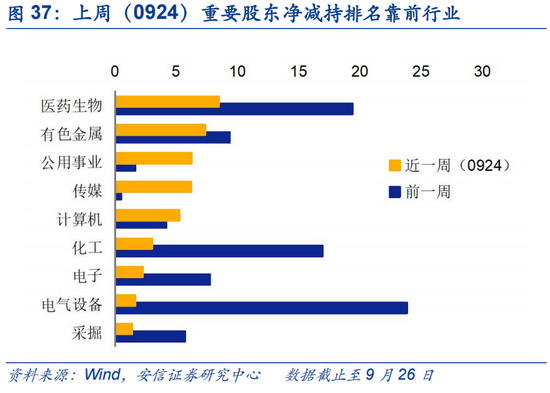 近期减持规模呈现增加态势,7月后整体禁压力有所降低。至9月26日已有披露,近一周重要股东净减持44.7亿元,前期净增持125.2亿元,为近两年来偏高水平;近期减持规模呈现增加趋势。净减持金额较高的行业包括医药(8.4亿)、有色(7.3亿)、公共事业(6.2亿)。