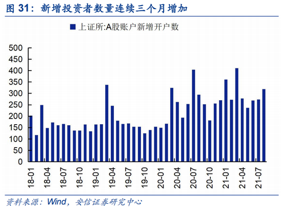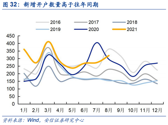 据中证登月度新增投资者数量显示,8月新增投资者账户数量187.46万户,自6月以来连续三个月呈现正增长,且高于17-20年同期水平,接近今年1月时水平。新增信用账户开户数连续三个月超过5万,高于16-19年同期水平。