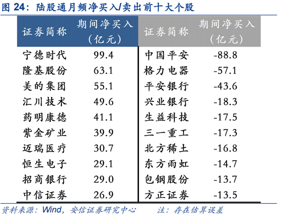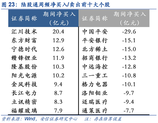 宁德时代、隆基股份、美的集团、三花智控连续多周获陆股通净买入居前,中国平安、平安银行、格力电器等连续多周遭净减持居前。本周,汇川技术、东方财富、宁德时代、赣锋锂业、隆基股份等获净买入居前;中国平安、平安银行、北方稀土、招商银行、中远海控遭净卖出居前。近一个月,宁德时代、隆基股份获净流入高达99亿、63亿。