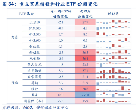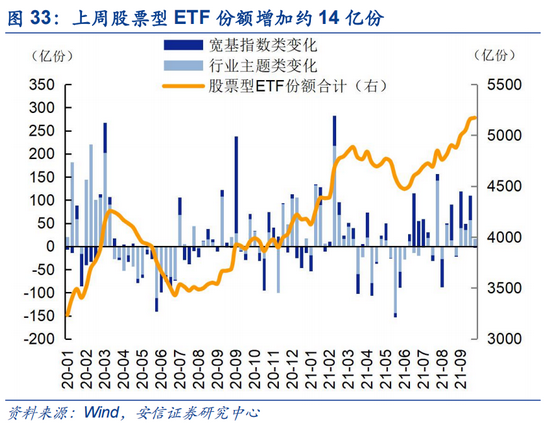股票型ETF份额增加约14亿份。分类看,宽基指数型减少约2亿份;行业主题类增加约16亿份,其中,券商(+18亿)、银行(+7亿)ETF份额增加较多。