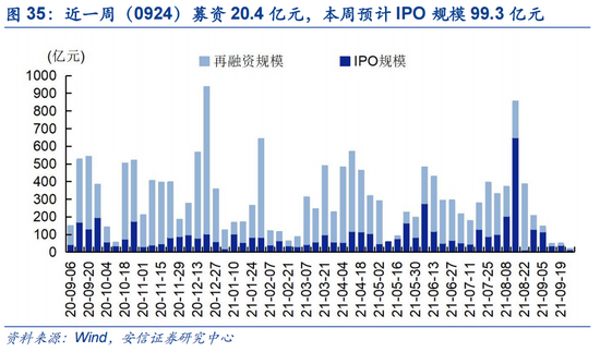 本周资金需求处于正常水平。按发行日划分,近一周(0924)股权融资规模共20.6亿元,处于历史偏低水平,其中IPO融资16.1亿元。预计本周(0927-0930)将有7只新股将进行网上发行,预计募资99.3亿元。
