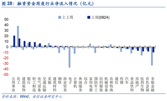 融资资金本周延续净流入周期板块。以周频看,至9月24日,公共事业(20亿)、化工(15亿)、建装(10亿)、银行(8亿)、轻工(8亿)获杠杆资金净增持居前;非银(-10亿)、有色(-8亿)、医药(-8亿)找减持居前。化工、公共事业等行业连续多周获融资资金净买入居前。