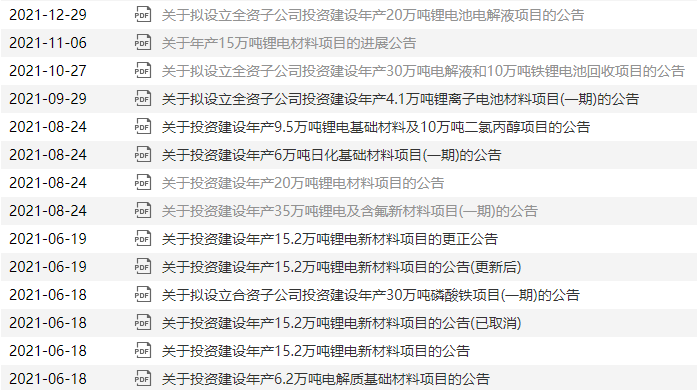 再往前的2021年6月,天赐材料计划投资超20亿元,建设三个项目,包括年产30万吨磷酸铁项目(一期)”、年产15.2万吨锂电新材料项目和年产6.2万吨电解质基础材料项目。