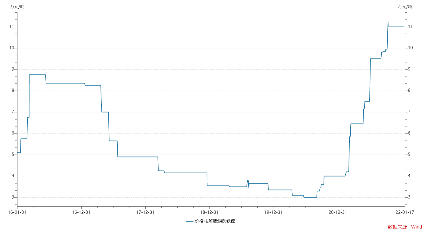 电解液价格曾走出“V”型反转,由2017年底的5万元/吨跌至3万元/吨,后回升并于2021年10月突破11万元/吨关口,至今仍保持高位。
