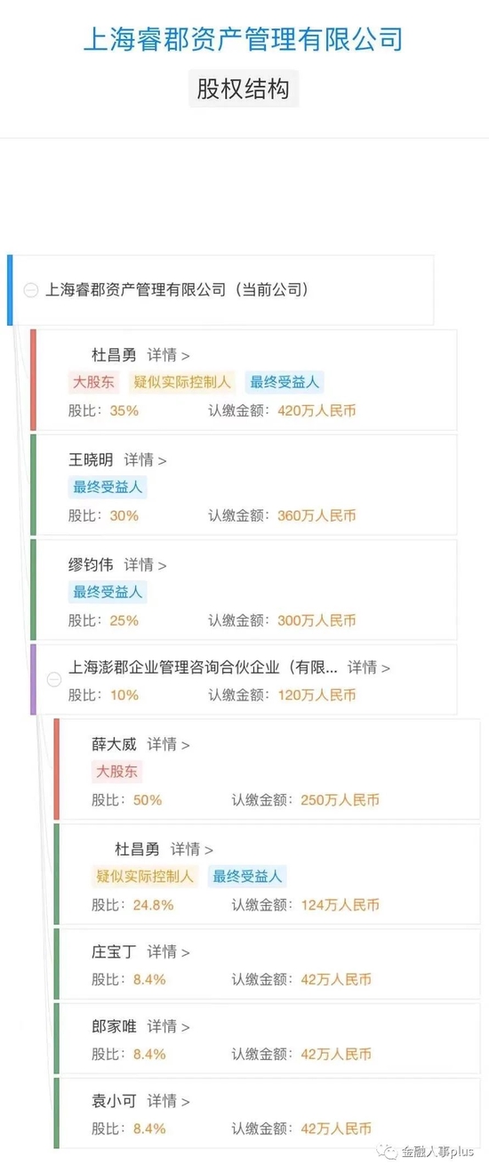 据睿郡资产和天眼查最新资料,该公司核心团队包括执行董事杜昌勇,持股占比35%;首席投资官王晓明,持股30%;总经理缪钧伟,持股25%。