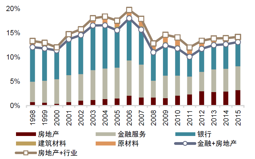 美日股市表现和房地产泡沫周期变化较为吻合,房地产相关行业在泡沫期跑出超额收益。房地产泡沫期,美日两国的股市,金融/银行、房地产、建材、原材料等房地产相关板块表现均好于总体,而进入“后地产”时代,两国股市主要为科技、医药、汽车等板块表现较好,房地产相关行业则表现落后。美日的股票市值结构也呈现类似特征,房地产相关行业板块市值占比与房地产周期较为相关,分别在89-91年左右和06-07年见顶以后逐步回落。
