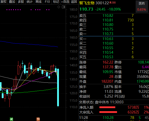 今天早盘沪强深弱再现,创业板指一度跌近1%。权重股智飞生物突发跳水,上午收盘跌超18%。按照最新股东户数89342户计算,早盘的下跌让智飞生物的投资者户均亏损近44万元。除了智飞生物外,疫苗板块另一只千亿市值龙头万泰生物也被砸跌停。