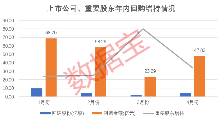 数据宝统计,截至4月14日,本月内上市公司已回购金额接近48亿元,是3月份的两倍多;34名重要股东月内开启增持计划,数量超过今年1月份、2月份。