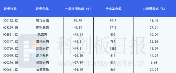 持有基金数量排名前十为:药明康德、迈瑞医疗、百洋医药(301015.SZ)、智飞生物、长春高新、恒瑞医药、爱尔眼科、凯莱英、泰格医药、爱美客(300896.SZ)。
