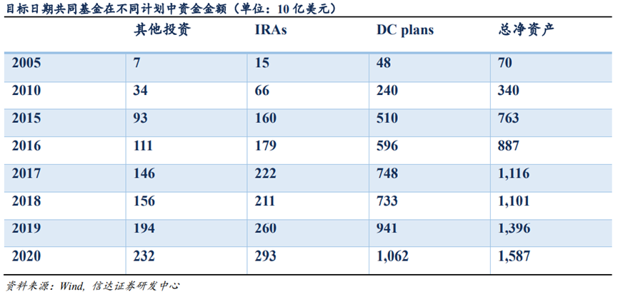 在IRA账户中,目标日期共同基金由2005年150亿美元,上升到了2020年的2930亿美元。(数据来源:Wind,截止日期2020/12/31)