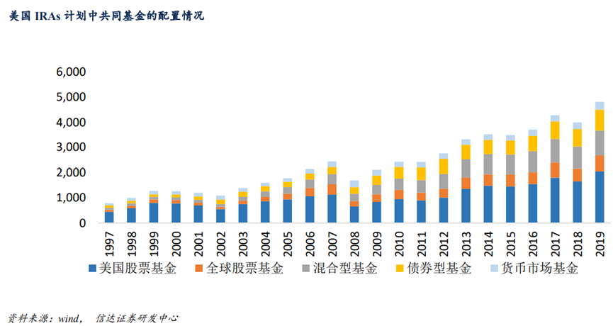 截至2020,根据ICI统计,共同基金是IRA 账户的主要投资工具,IRAs 计划中的共同基金共计5.6万亿美元,占总投资的45%左右。