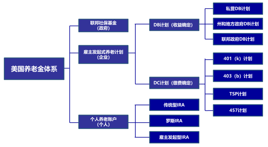 美国的养老体系同样由三大支柱构成,自1875年美国运通公司建立了第一家企业养老金至今,美国的养老体系已有超过百年的历史。