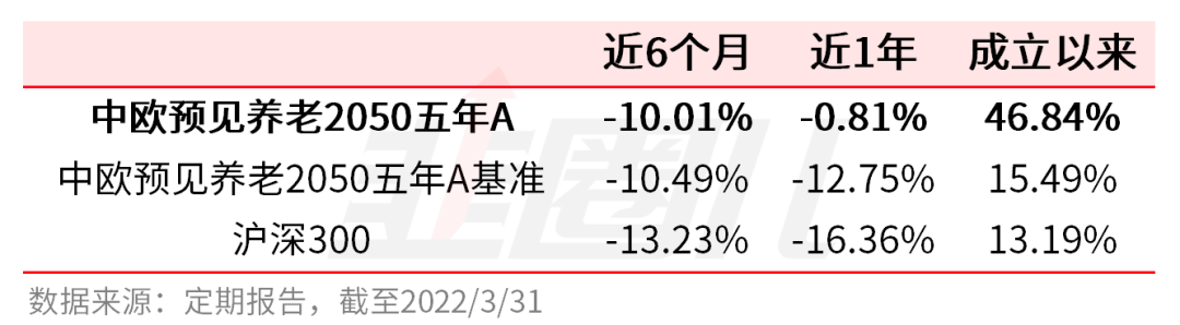 收益方面中欧预见养老2050A(FOF)同样没有拉跨,截至一季度末,成立至今收益46.84%,同期基准表现15.49%。