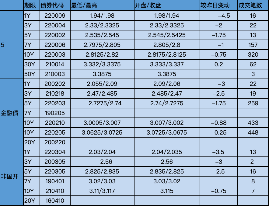今日国开市场需求较好。3Y考虑返费后结果为2.4727,低于二级3.7BP发出。5Y考虑返费后结果为2.7098,低于二级2BP发出。7Y考虑返费后结果为2.9638,低于二级5.3BP发出。