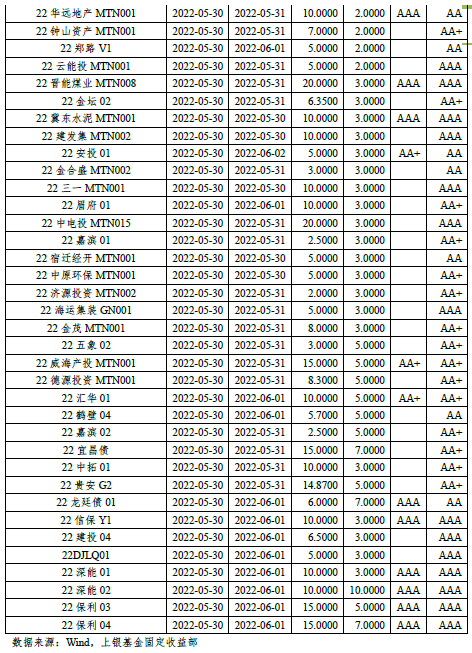 宏观及利率债方面,上周“稳住经济大盘工作会议”核心内容有三点,一是讲困难,“3月份尤其是4月份以来,一些经济指标明显走低,困难在某些方面和一定程度上比2020年疫情严重冲击时还大”;二是提要求,“把稳增长放在更突出位置,着力保市场主体保就业保民生,保护经济韧性,努力确保二季度经济合理增长和失业率尽快下降,保持经济运行在合理区间”;三是抓落实,“国务院26日将向12个省派出督查组,对政策落实和配套开展专项督查。对各地二季度经济主要指标,将由国家统计部门依法依规实事求是分省公布,国务院对相关工作情况予以通报”。本次会议稳增长、保就业目的明确,但增量政策有限,延续了5月23日国常会提出的6方面33项措施。目前疫情影响在逐步缓解,经济最困难阶段或已过去,但5月整体经济数据仍不乐观,宽信用政策效果有待证实,在此期间,宽松的货币政策对债市仍有支撑。目前短端品种拥挤,长端品种大幅下行后不宜过分追高,建议维持中性久期、中高杠杆。